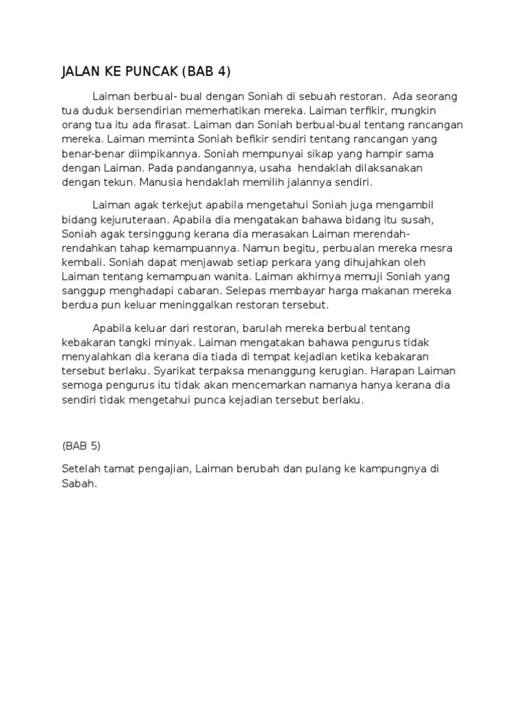 Jalan ke puncak :sinopsis bab. Sinopsis bab 4, 5, 6 (novel tingkatan 2) sinopsis bab 4 laiman dan soniah menghabiskan cuti hujung minggu dengan . Laiman dari sabah, menjalani latihan praktikal di sebuah syarikat minyak di sarawak.